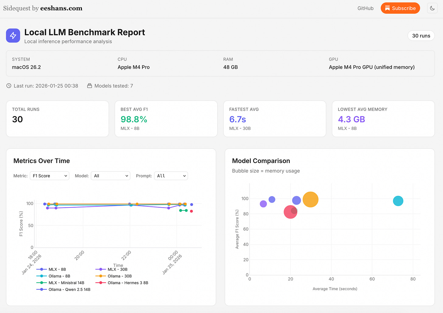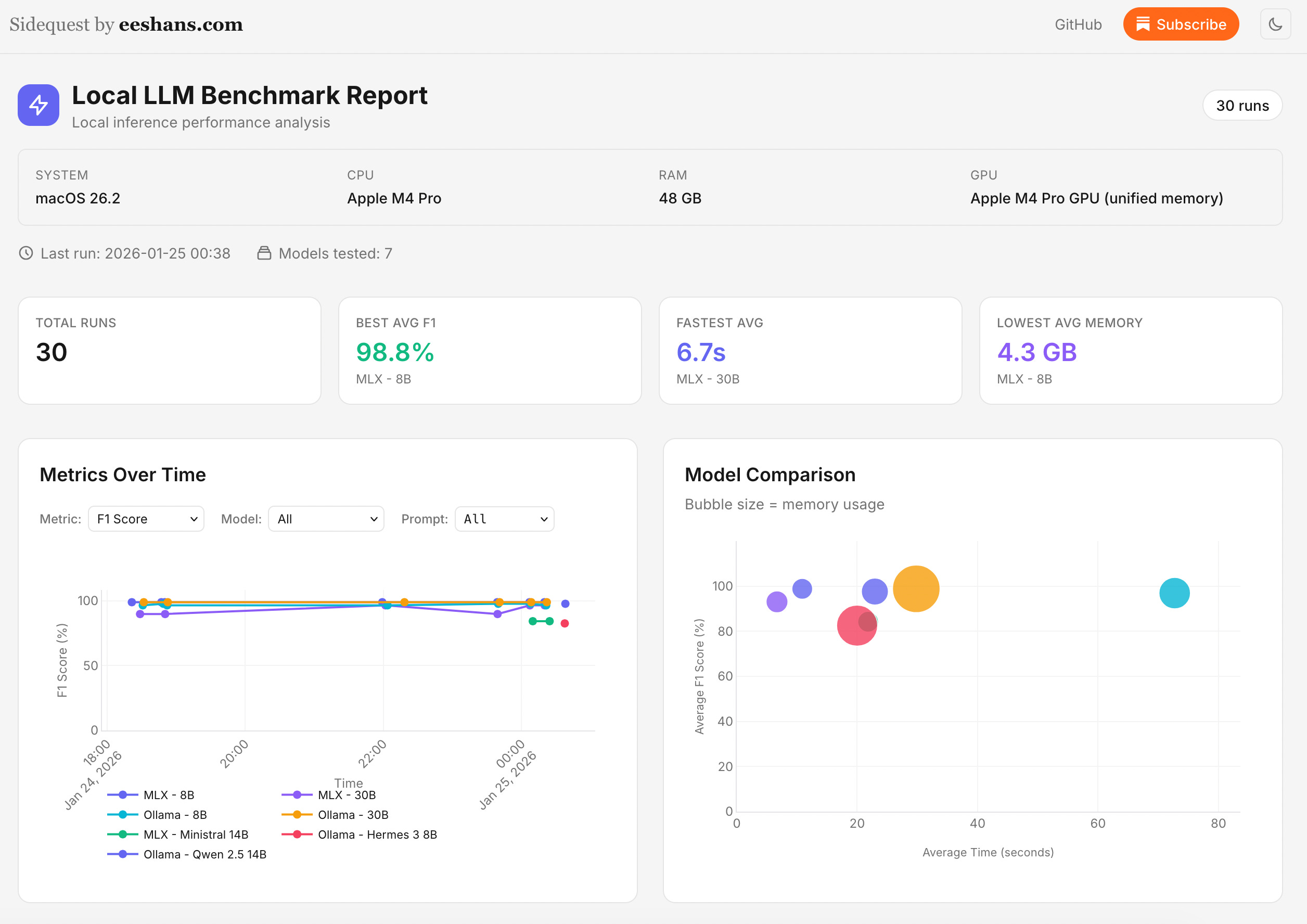 To keep tabs on how local models are progressing, I built a small benchmark runner to test speed, accuracy and memory usage for structured signal extraction on my laptop’a hardware. Currently it’s only testing a single use case, but I’ll expand this to a much more exhaustive benchmark in the future. The benchmark runner outputs an interactive report. It shows model comparisons, system specs, and speed, accuracy, and memory trade-offs across MLX and Ollama. If you have an Apple silicon mac, you will like MLX. View Report | View Source